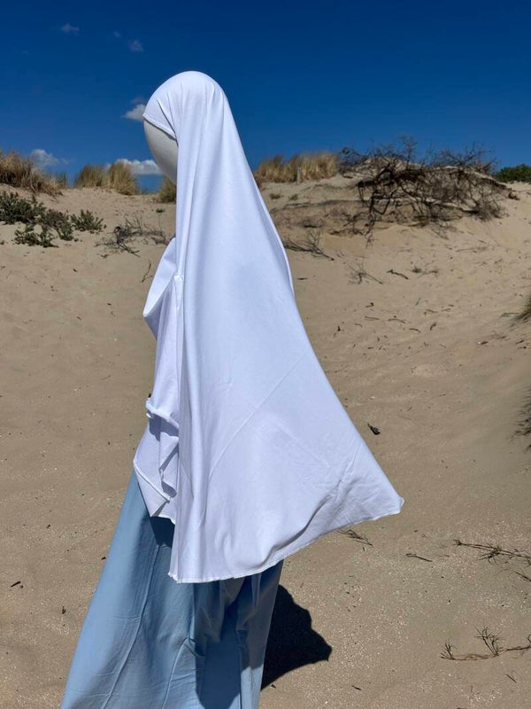 Let op: Om de khimar volledig sharie’a-conform te dragen, raden wij aan om ook het gedeelte onder de kin (vanaf de kaaklijn naar de keel) te bedekken. Gebruik hiervoor een elastische kinbedekker of een onderkapje met kinbedekking.