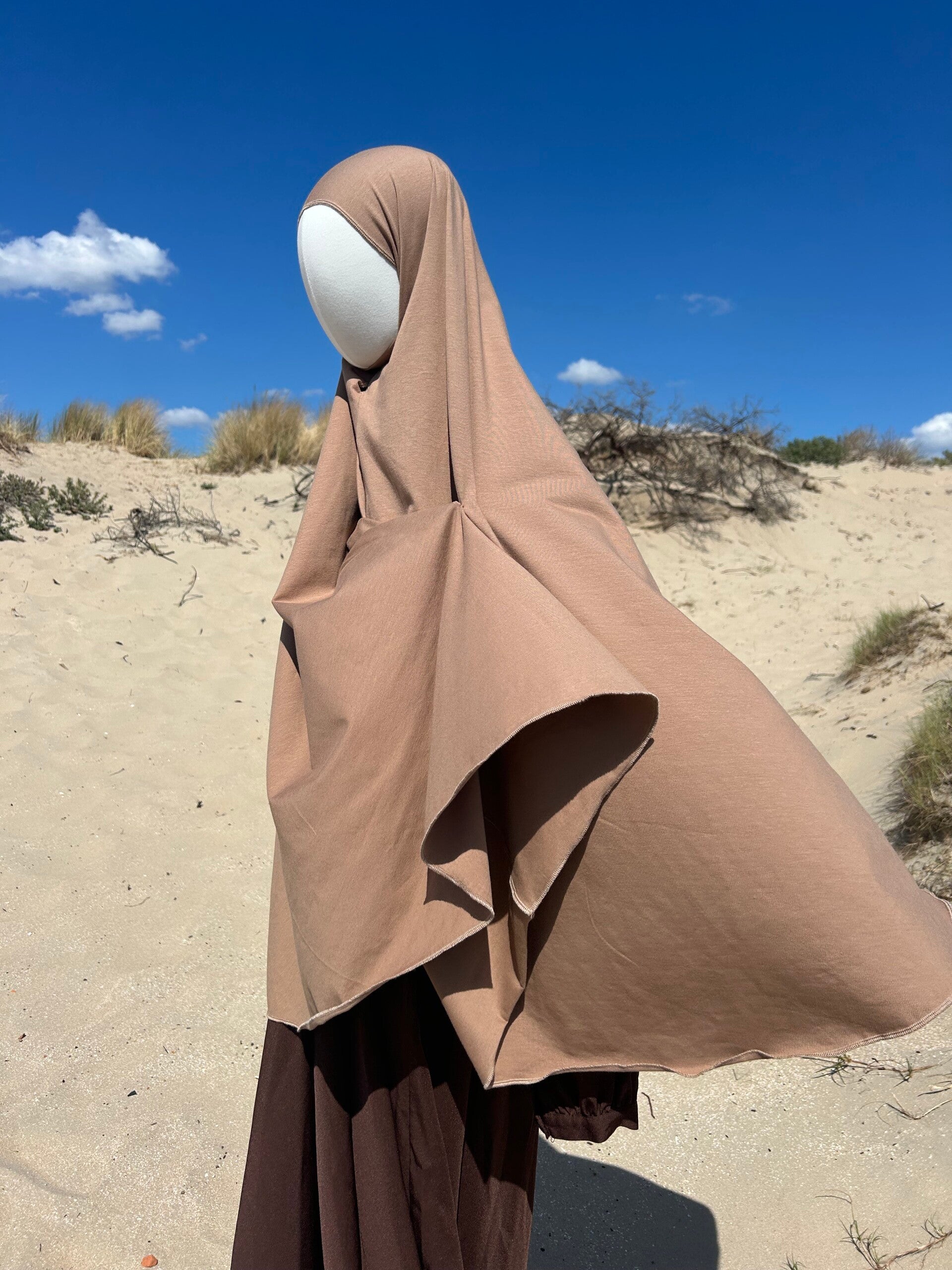 Deze khimar is speciaal ontworpen voor warme dagen. De luchtige stof voelt licht aan en blijft comfortabel, zelfs tijdens hogere temperaturen. De stijl doet denken aan de welbekende jersey setjes, maar onderscheidt zich door het gebruik van natuurlijke materialen.
