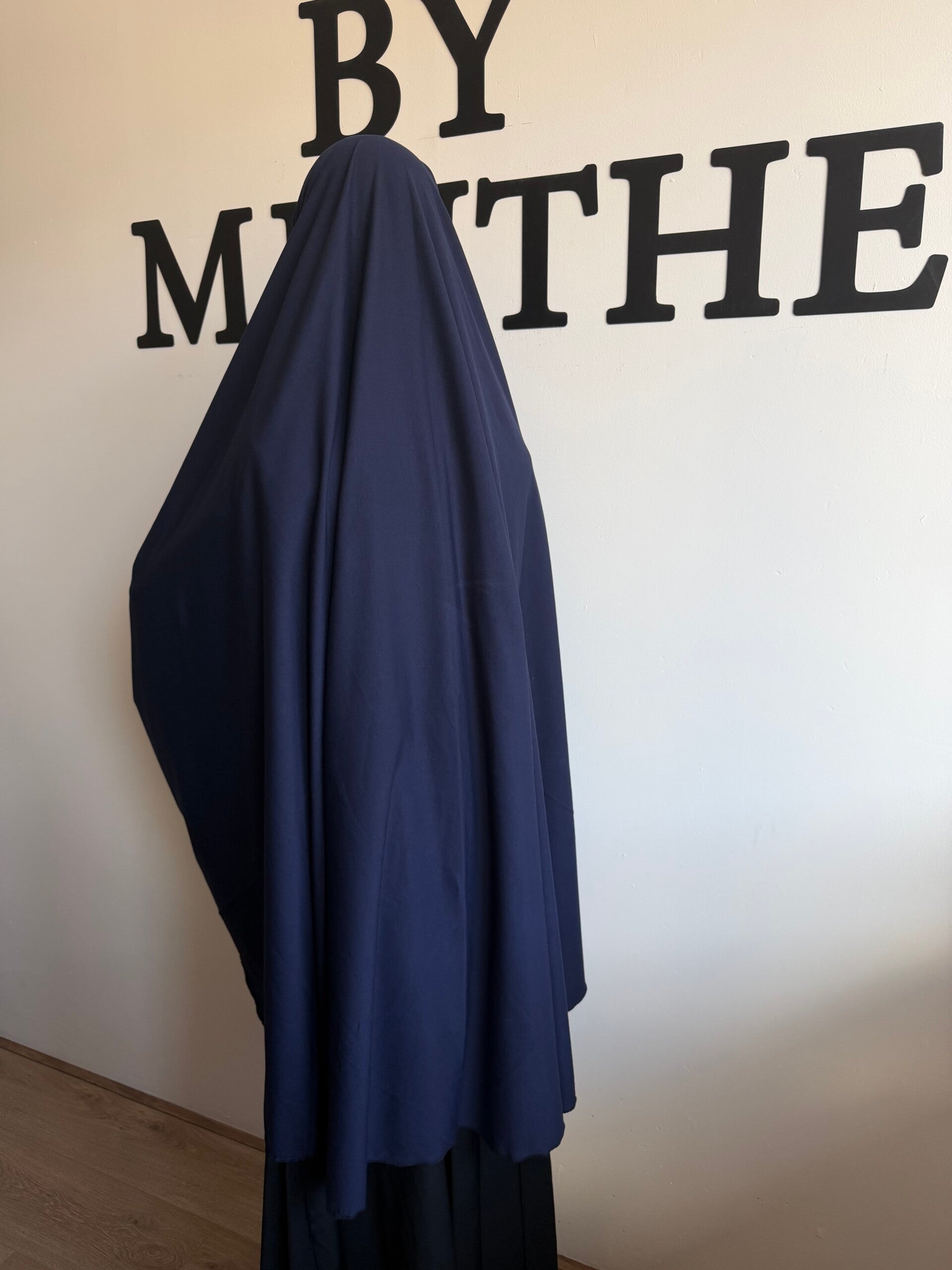 Let op: Om de khimar volledig sharie’a-conform te dragen, raden wij aan om ook het gedeelte onder de kin (vanaf de kaaklijn naar de keel) te bedekken. Gebruik hiervoor een elastische kinbedekker of een onderkapje met kinbedekking.