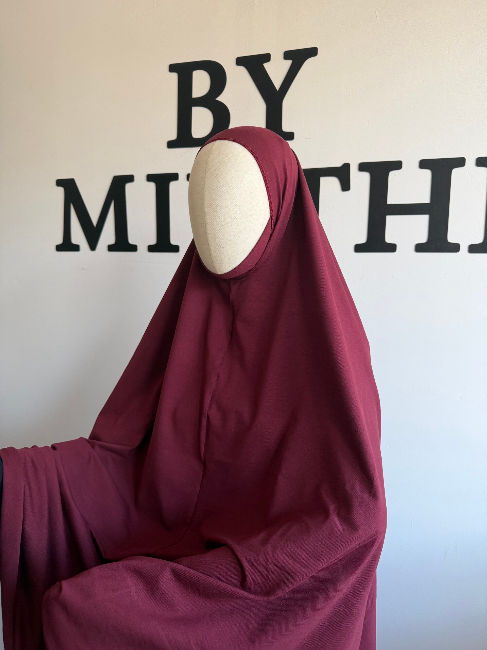 Deze khimar is speciaal ontworpen voor warme dagen. De luchtige stof voelt licht aan en blijft comfortabel, zelfs tijdens hogere temperaturen. De stijl doet denken aan de welbekende jersey setjes, maar onderscheidt zich door het gebruik van natuurlijke materialen.
